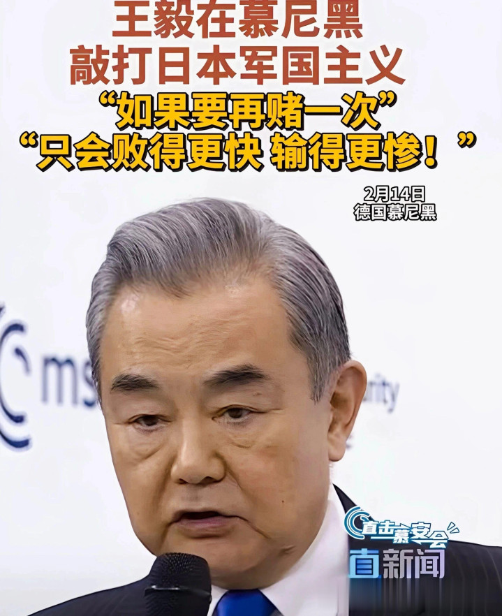 王毅在慕尼黑说的那段话值得每个日本东谈主听一遍:“日本东谈主民应该不要再被那些极右的、致使想回生军国主见的势力所裹带、所蒙蔽。”