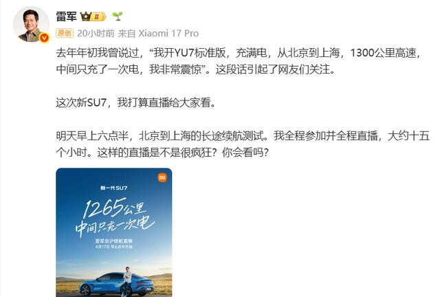 雷军这场京沪续航直播,名义是在阐发1265公里中间只充一次电,简直被摆上台面的,却不是续航自己,而是抒发格局,问题也不在车能不成跑,而在话该若何说,为什么一场测试会把信任拉到台前?