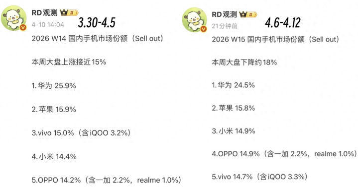 今天共享的是2026年W15国内手机名次榜,对应的技能规模是2026年4月6日4月12日,本周大盘着落约18%,简单盘算推算可以约为W13激活量的94.3%。在榜单排名方面,华为以24.5%的收成连续遥遥最初,苹果连续排名第二。小米重回榜单前三名,不外和OV并莫得拉开彰着的差距,以下是榜单的留意实验。
