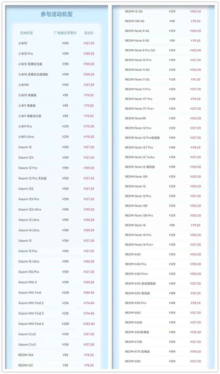 我还留意到部分“钉子户”机型的电池不便宜,比如红米K40、红米Note12 Turbo、小米10S、小米12/X等电池优惠后都要一百以上。最后吐槽一下,小米13和13 Pro、红米K70和Pro、K50至尊版都去哪了?它们不配么?